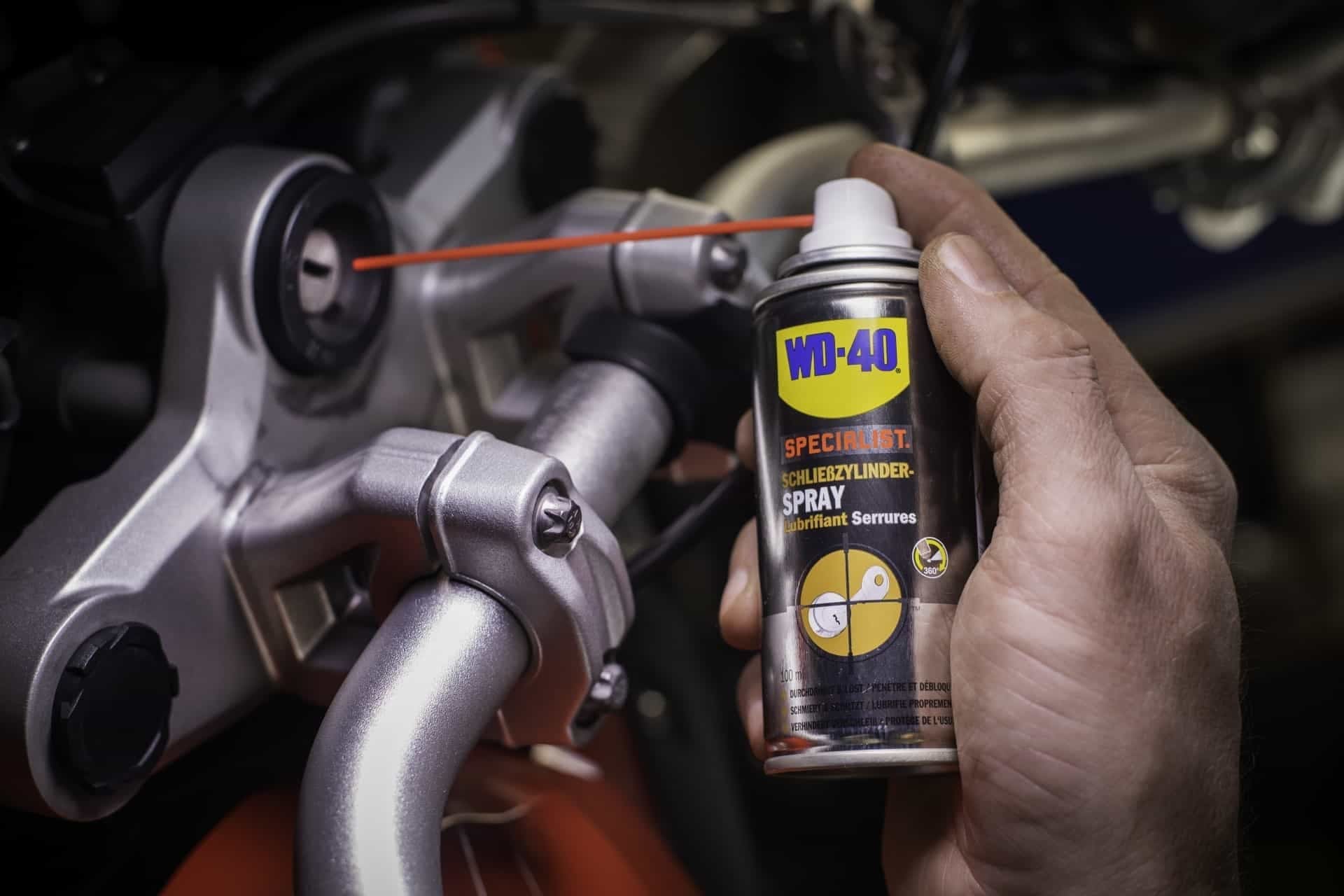 Das WD-40 Multifunktionsprodukt verfügt über ein Sprühröhrchen, das das gezielte Einsprühen des Schließzylinders ermöglicht. Sprühe das Produkt regelmässig auf die beweglichen Teile des Zylinderschlosses.